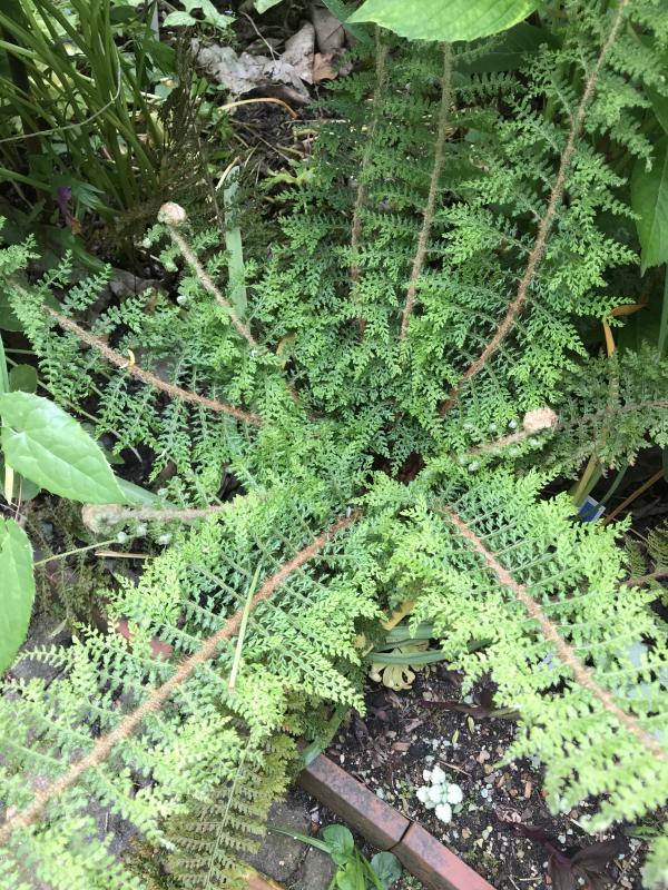 Athyrium ff. frizelliae 'Grandiceps' hat sich gut gemacht. Fast nackte Wedel mit einem Püschel obenauf.