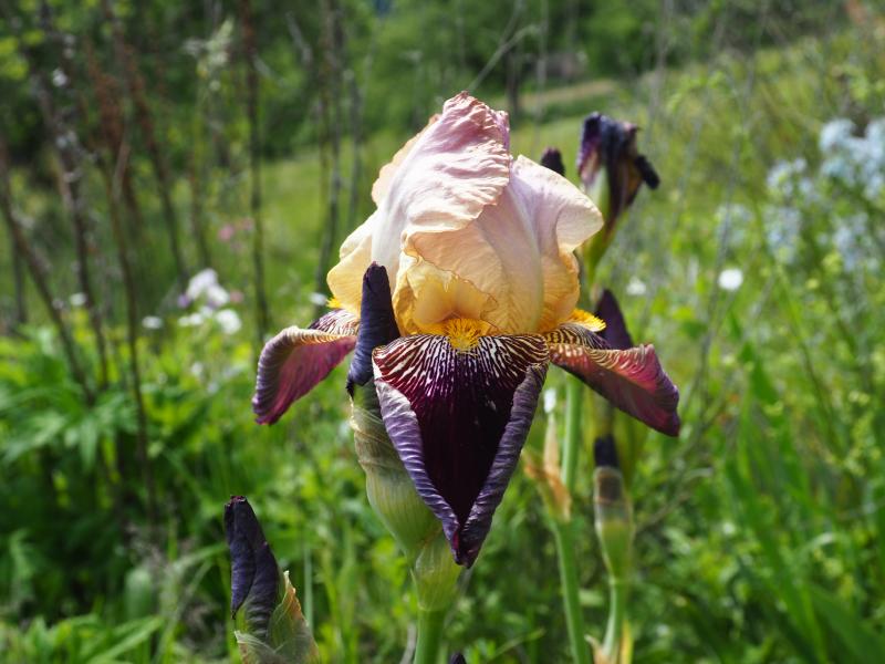 kaum zeigt man alte Bilder, wie neulich mit Elro, von seltsamen Iris, um das Kapitel abzuschließen mit diesen Irrläufern und um sich auf die wirklich gewünschten, die auch einen Namen haben, zu konzentrieren, ploppen sie überall hoch im Garten. Ich habe heute vor allem Iris gerodet. Falsche Maui Moonight, Iris flavescens, Iris Germanica "Hubert meint, die sei irgendwie blauviolett" und eben diese hier, schon wieder. Phantastische Farben, Tolle Textur. Aber unmöglich, was sie mit den falls macht.