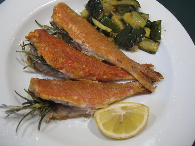 Sie wurden bemehlt und gebraten, dazu Zucchini und frisches Weißbrot.
