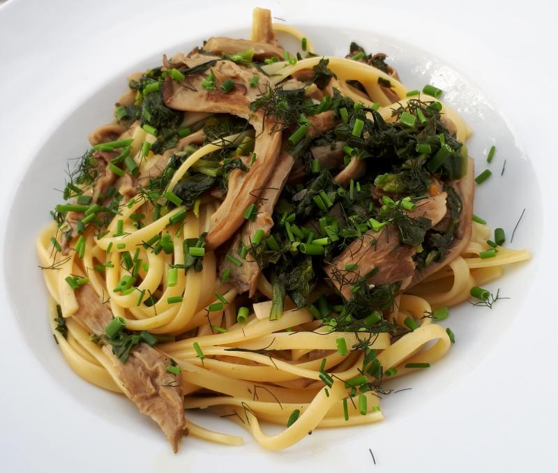 Heilbutt mit Chorta und Kartoffeln. Für die (?) Chorta habe ich Zucchinischeiben kurz angebraten und dann gemischte Blätter - größtenteils Nachtkerze, etwas Brennesseln, junger Knoblauch - dazu, dann Zitronensaft, Olivenöl, Pfeffer. Roh schmecken Nachtkerzenblätter eher langweilig, aber kurz angebraten oder gekocht entwickeln sie ein ansprechendes Aroma.