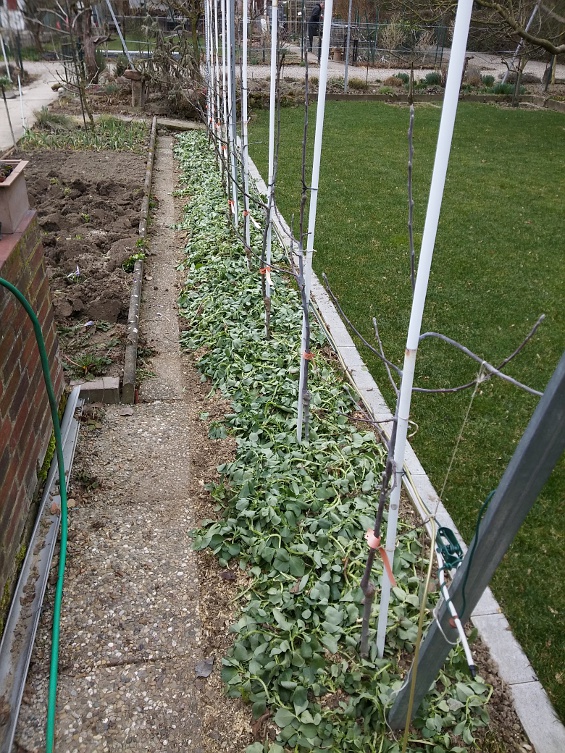 Als Mulch ist wieder Sägemehl aus der Kleintierabteilung im Laden zum Einsatz gekommen. Für Löwenzahn und anderes Unkraut kam im Herbst einmal Glyphosat zum Einsatz, damit nicht durch Bodenbearbeitung so spät im Jahr noch Stickstoff mineralisiert wird.