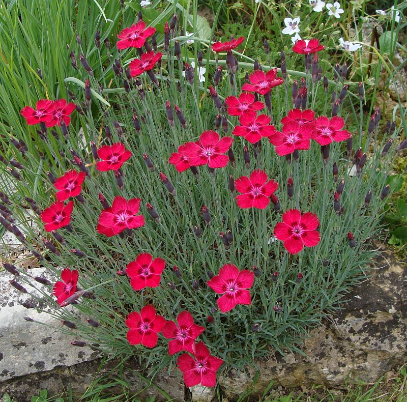 eine Nelke, deren Name ich nicht notiert hatte. Taucht in keiner meiner Exellisten auf. Kennt jemand die? Graugrünes Laub, dichte Polster bildend, dicht über dem Laub blühend, weiß.
