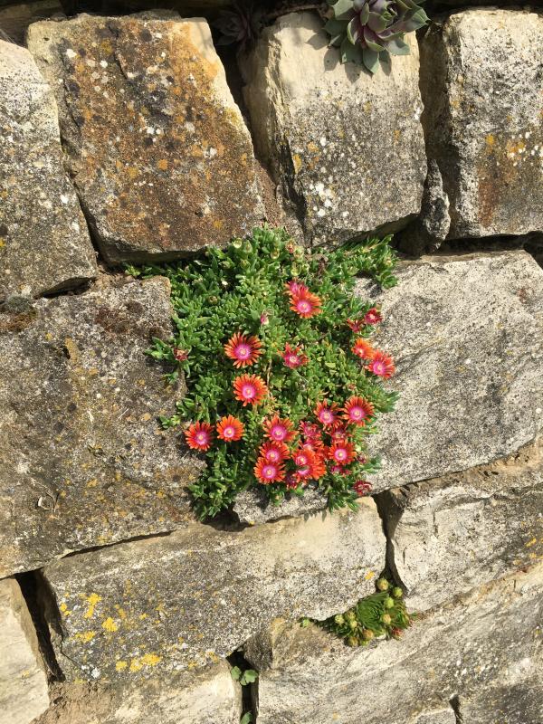 hier wachsen die Delosperma-Hybriden auch in Verbindung mit Steinen. Letztes Jahr sind einige vertrocknet.