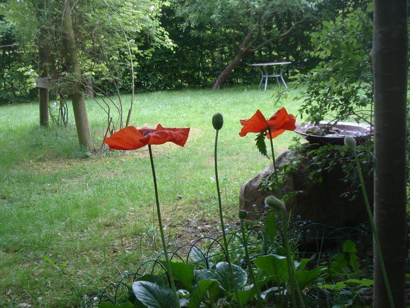 Reduzierte Blütenpracht ( roter Mohn ), grüne Kulisse.