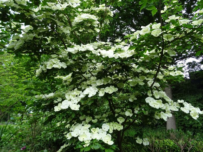Blüht jedes Jahr sehr reich: Cornus kousa 'Milky Way' (Pflanze hat im Dürresommer 2018 reichlich Wasser bekommen)