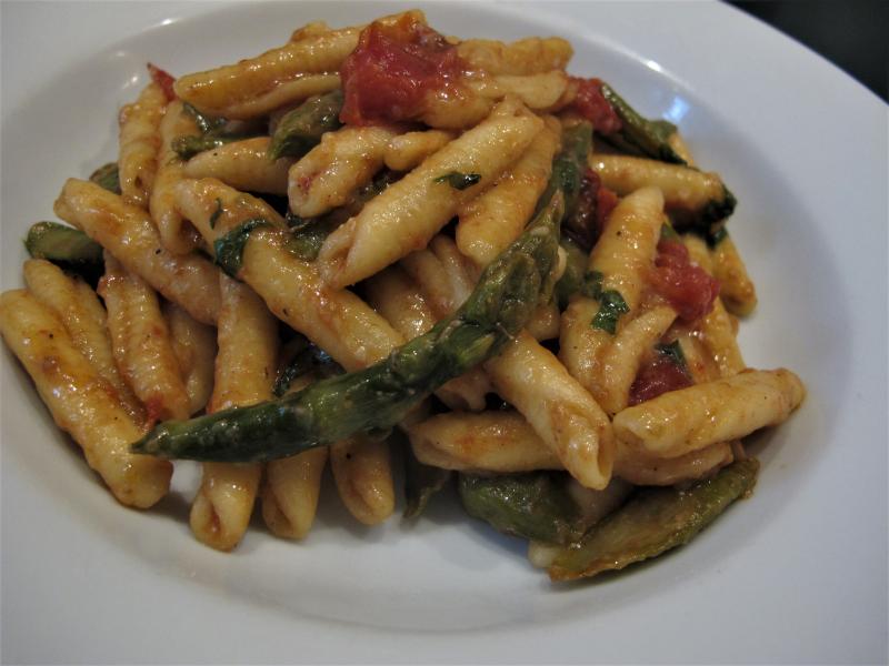 Maccheroni al pettine mit Grünspargel, kleinen aangebratenen Tomaten, etwas Hühnersuppe, Parmesan und frischer Butter, gut gepfeffert.