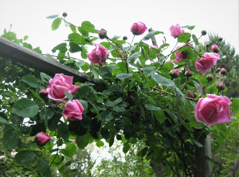Climbing Mme Caroline Testout. Viele duftende Blüten, öfterblühend und starkwüchsig.