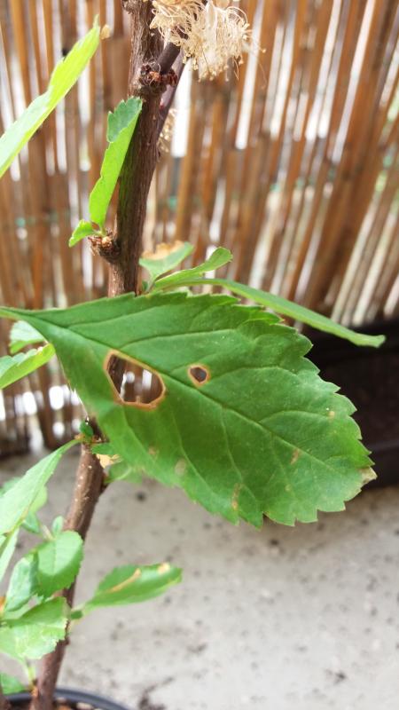 Jetzt ist mir aufgefallen, dass er in einigen Blättern Löcher hat. Aber ich sehe keine Läuse. Wisst ihr was das sein kann? Seine verblühten Blüten hat er auch immer noch.