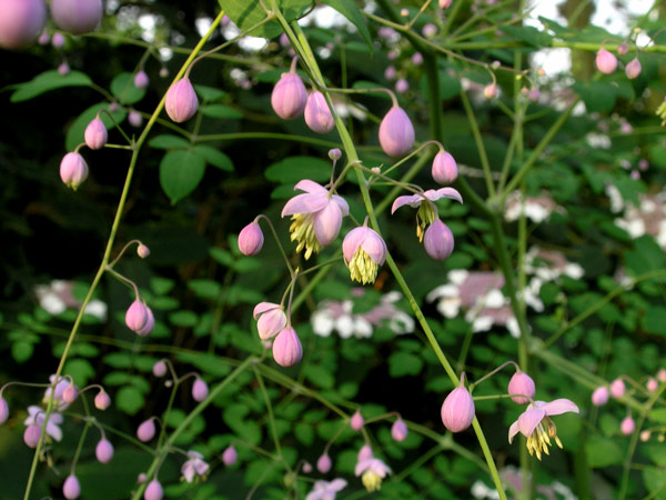 Wunderbares Gespann, aber kaum zu fotografieren: Thalictrum delavayi und eine Samtblatthortensie, die dieses Jahr blühen darf, meistens aber zurückgeschnitten wird und dann ein Blattschmuckgehölz mit riesigen Samtblättern, aber keinen Blüten ist.