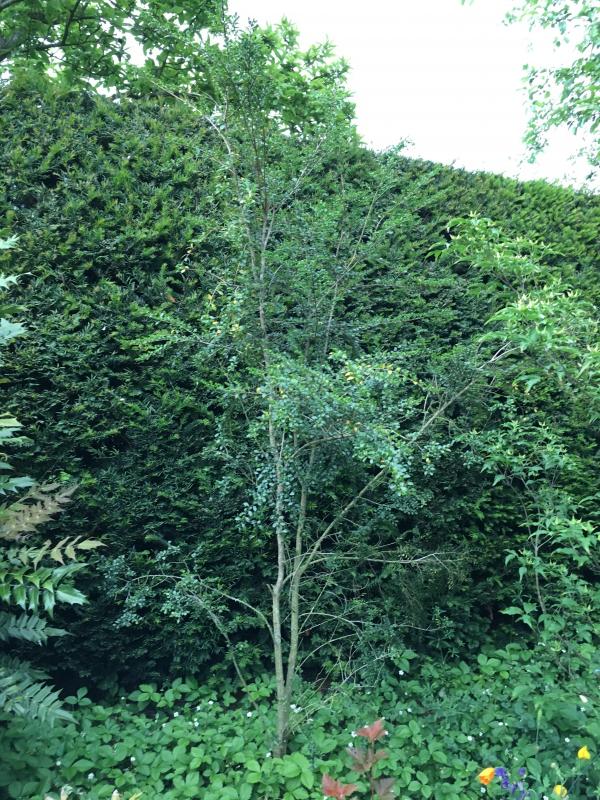 Ich denke, die Blattfarbe des Mispelersatzbaumes sollte eher hell sein, da direkt dahinter die Thujenwand der Nachbarn kommt - und ich habe keine Ahnung, wie hoch die dieses wachsen lassen wollen.