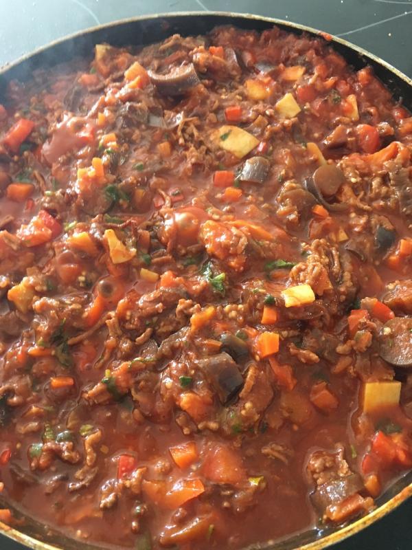 Nudeln mit Hackfleischsoße mit den restlichen eingefrorenen Zucchini und Auberginen von letztem Jahr. Schafskäsebrösel kamen auf dem Teller noch drüber. Salat dazu .