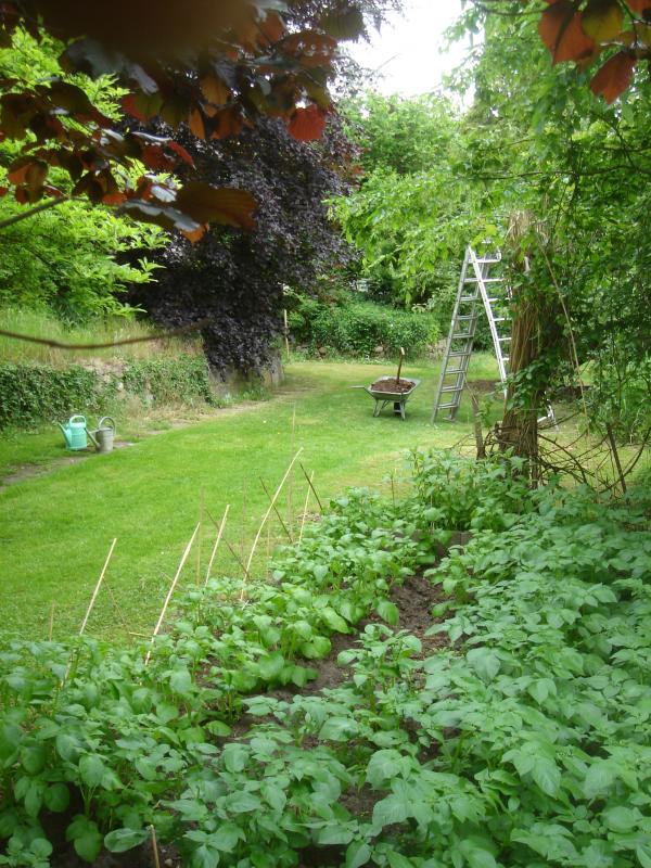 Gartenarbeit heute : nicht viel. Nur Kartoffeln angehäufelt und kranke Neuaustriebe aus Apfel " Ruhm von Kirchwerder " herausgeschnitten ( Leiter im Hintergrund. Absterbende , braune Blätter, davor wellige und dunklere Asttriebveränderung ,