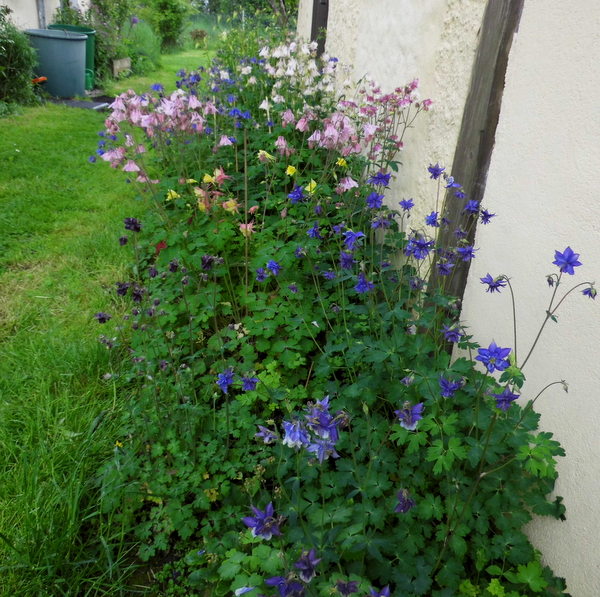 Akelei entwickelt sich in unserem Garten zur "Plage". Nein, sie bleiben stehen, aber sie wachsen in Wegeritzen und auf Rasenflächen. Die Farben reichen vom dunklen, fast schwarzen Blau bis hellrose, einfach, gefüllt, zweifarbig. Ich könnte mit Bildern hier Seiten füllen. Hier mal eine Farbe, die neu ist in unserem Garten.