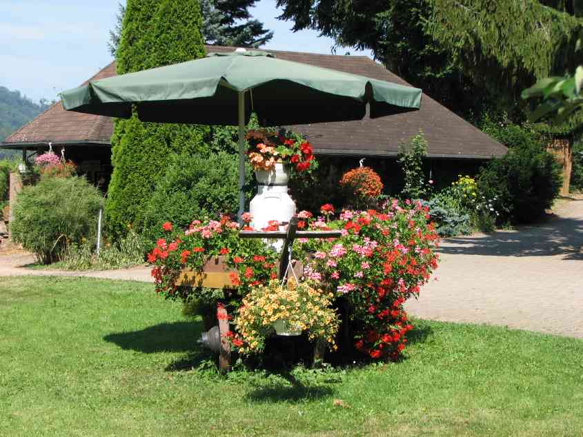 Blumenschmuck auf einem Leiterwagen in einem Vorgarten.