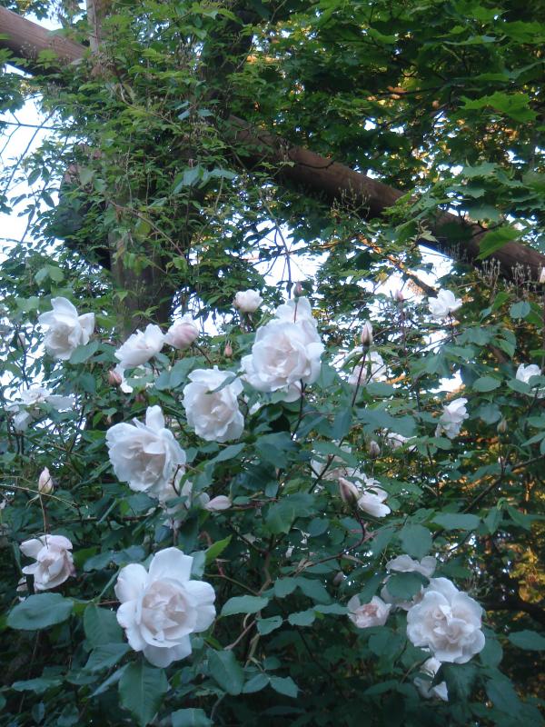 Die erste 'Westerland' (wurzelecht von Schlüter) von drei Büschen, benachbart zu einem Geschenk der Vögel, einem Holunder in Einzelstellung hat die erste süß duftende Blüte geöffnet. Die Vögel, meine Gartengestalter, haben den Holunder an das schönste von allen Seiten einsehbare Gartenzentrum gepflanzt!