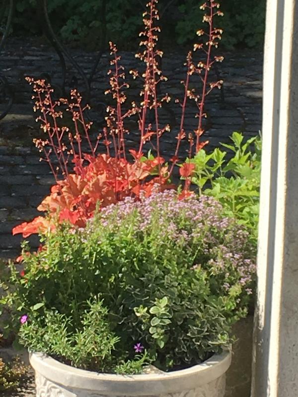 Ich meine den hinteren Topf mit Heuchera (Caramel?), Thymian und das Grüne, ich komme grad nicht drauf (Bergminze? oder irgend in diese Richtung?) und habe meine Pflanzenschilder nicht hier.