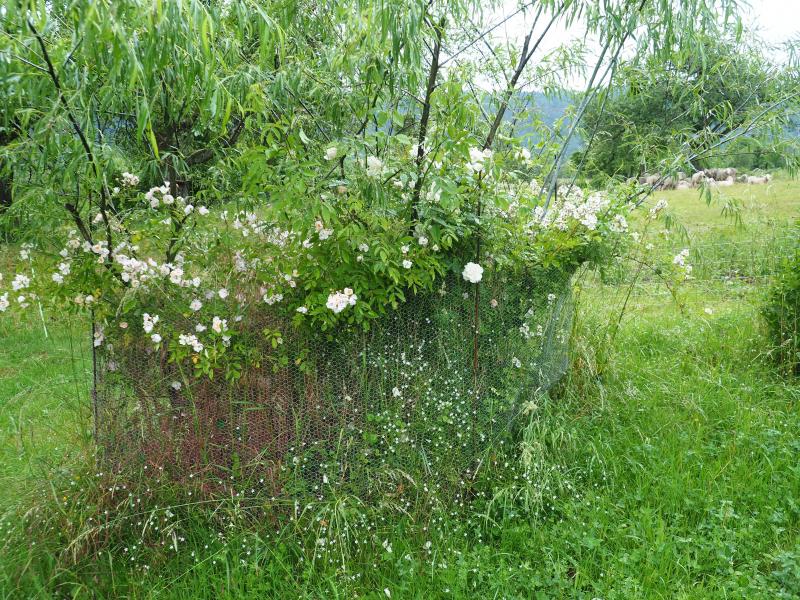 heute im Wiesengarten und plötzlich sind die Rosen alle da. Die in der Drahthose mit der Weide, Salix acutifolia 'Blue Streaks', gedeihen prächtig. Rosa Noisettiana 'Mme Alfred Carrière', Rosa multiflora 'Souvenir de Carmen Figueroa-Meyer' und Rosa multiflora 'Nana'. Die 'Souvenir de Carmen Figueroa-Meyer' ist eine Züchtung von Mark Brown.