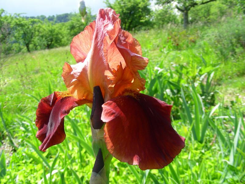 "Ziegelrot, weithin leuchtend. D = geschlossen, H = halbschwebend (kein Samt, wie nahezu alle roten Iris), ... Die Schlundaderung ist bei der lebhaften Farbe wenig auffallend; Substanz ausreichend unter normalen Witterungsbedingungen. ... 85 cm" (Viktor von Martin)
