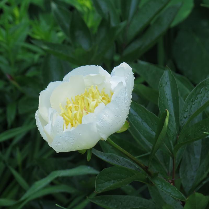 Dieser weiße Sämling ist nur 60-70cm hoch und ähnelt Immaculee. Die Sorte wächst aber in diesem Gartenbereich nicht. Daneben sind nur stark gefüllte und Krinkled White, das wird wohl die Mutter sein.