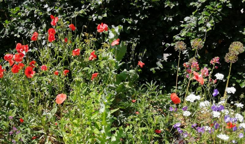 Ich schaue so gerne von oben auf meine "Black-Box-Area". Natürlich hat sich nicht alles selbst angesiedelt aber sehr viel. Nachdem die Kiefer gefällt war, bin ich nicht zum Einkaufen gekommen, eigentlich sollten kleinere Gehölze dort stehen. So blieb ein Ableger des Cornus alba 'Sibirica Variegata' und des Rubus thibetanus, eine Hortensie aus der Endless Summer Serie bekommt man ja in jedem Supermarkt. Ein Sämling der Rosa glauca ist noch sehr klein, behauptet sich aber.