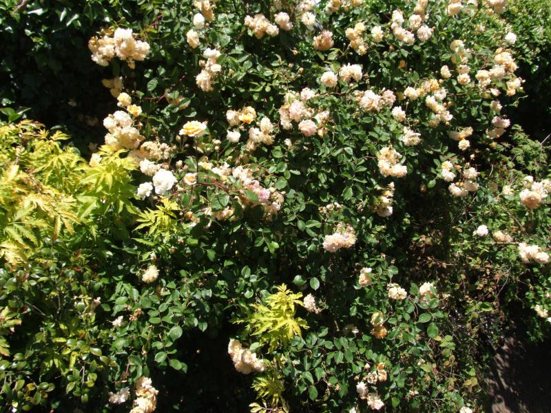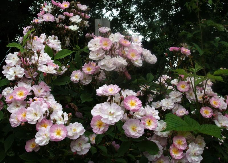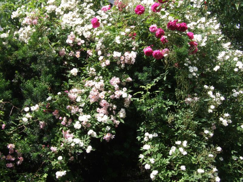 ´Parkjuwel´, ´The Garland´und ´Hackeburg´sind etwa 4 m hoch in eine Eibe geklettert. Letztere hat eine ältere Gartenfreundin aus ihrer Kindheit als mehr lila in Erinnerung. Der Anbieter beschrieb sie als lilarosa, die Blüten der gelieferten Rose würde ich aber schlicht als rosa bezeichnen.