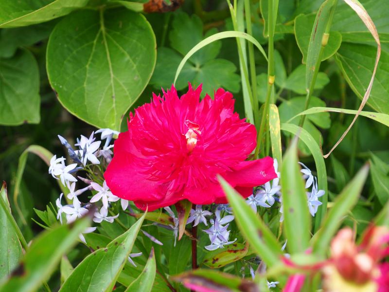 Paeonia 'Edgar Jessep', der große Bruder von 'Henry Bockstoce' legt sich auch lässig in das Gras. Umflort von der Gras-Sternmiere.