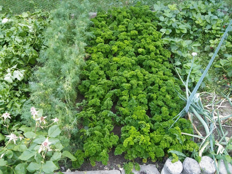 Wenn sie in Reih und Glied gepflanzt ist, kann ich mit dem Arm unten lang fahren und die Unkräuter mit den Fingern einfach einsammeln. Wenn dabei etwas übrig bleibt, bekommt es wegen der Petersilienblätter darüber kein Licht ab und wächst nicht weiter. Die Petersilie ist sauber, ohne groß Aufwand und ohne viel kaputt zu machen. Keine Bodenbewegung usw. Man kann so selbst im dunkeln jäten, man spürt wo Unkraut ist und lässt sich von den kräftigeren Petersilienstängeln leiten. Man darf beim blind jäten nur keine Angst haben mal in eine Spinne oder ähnliches zu greifen.