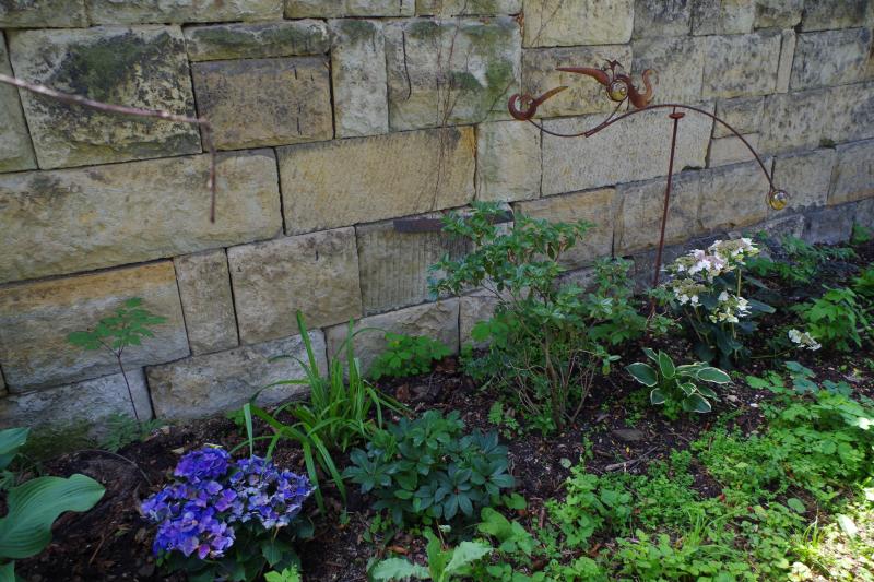 Seltsamerweise blieb mir fast 20 Jahre verborgen, wie hübsch die Mauer eigentlich ist, jahrelang standen die Komposthaufen davor :-\ Die wanderten nach und nach weiter, und letzte Woche habe ich nun endlich mein "Paulinerbeet" bepflanzt. Sieht noch ziemlich mickrig aus, aber es wird sich füllen :D