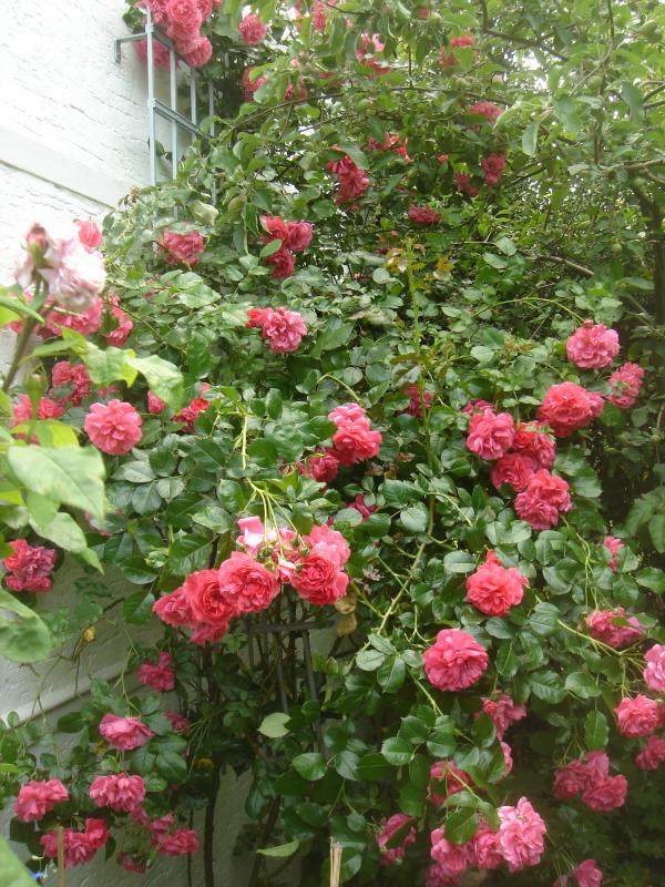 Rosarium Ütersen, an der Westseite des Hauses, an einem Klettergerüst vom letzten Schmied vor Ort, beides ( Rose / Klettergerüst) als