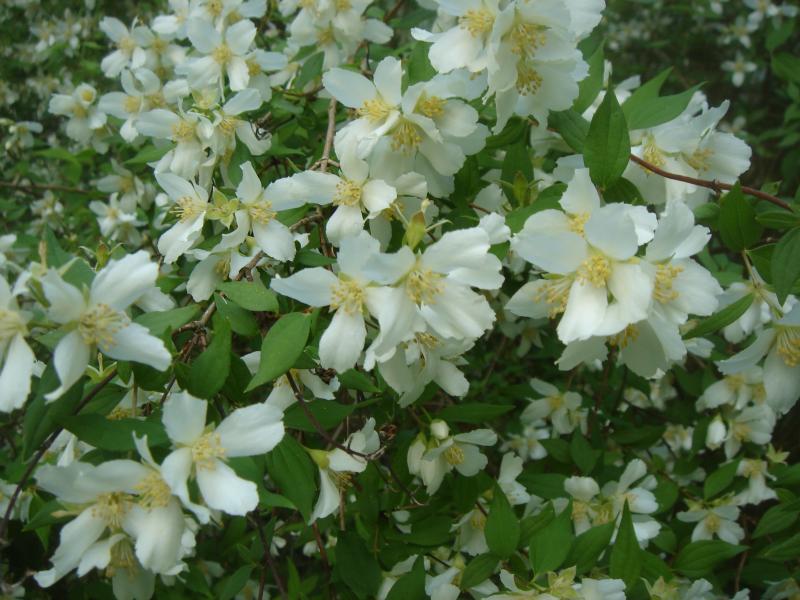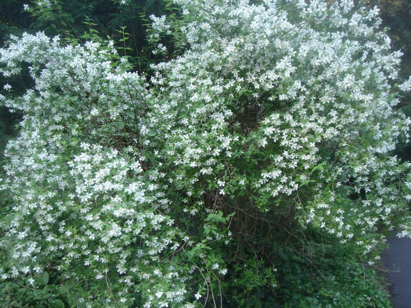 Ca 1,50 m hohes Gehölz , über und über mit weißen einfachen Blüten, sehr stark süßlich duftend.