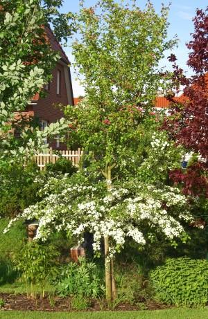 Moin,zum Thema "Okulieren" kann ich mal aus eigener Erfahrung berichten. Vorweg sollte ich vielleicht sagen, dass ich alles andere als ein Gartenexperte bin.Vor einigen Jahren habe ich öfter mal laut darüber nachgedacht, dass ich gerne einmal das Veredeln von Bäumen ausprobieren wollte. Jemand hörte diese Laute und schenkte mir ein Buch über das Veredeln.Das Okulieren erschien mir am einfachsten und am effektivsten. Man braucht wenig "Edelmaterial" und kann gleich mehrere Versuche an einem Baum durchführen.Hippe und Okulations-Schnellverschlüsse hatte ich nicht - ein Kartoffelschälmesser und etwas Bast waren aber vorhanden. Und etwas Baumwachs war schnell besorgt (wenn auch sündhaft teurer als erwartet ...). Und dann ran an den alten Apfelbaum, der sowieso eher überflüssig war. Gleich auf Anhieb hat es bei 3 Okulationen geklappt, es war kein Fehlversuch dabei. Und das ohne Desinfektion, nur mit etwas sorgfältigerer Sauberkeit: die Stelle des T-Schnitts sorgfältig mit klarem Wasser gesäubert und das Kartoffelschälmesser immer mit heißem Wasser gespült.Davon ermutigt, bewahre ich mittlerweile immer aus gegessenen Äpfeln einige Kerne auf und ziehe Sämlinge, auf die ich dann Edelsorten okuliere. Das geht im Sommer recht gut. Man kann ohne schlechtes Gewissen in öffentlichen Anlagen immer ein paar Obstbäume finden und Edelreiser schneiden, ohne dass jemand darunter leidet, denn geeignete Zweige, die sowieso weggeschnitten müssen, findet man immer.Mittlerweile habe ich es auf 4 selbstveredelte Apfelbäume, davon 1 Apfelbaum mit 4 verschiedenen Sorten, gebracht. 3 dieser Bäume sind schon mehr als 2,50 m hoch. Wie bei Sämlingen zu erwarten, wird das wohl nicht das buchstäbliche Ende der Fahnenstange sein. Wer es lieber kleiner mag, sollte sich vielleicht andere Unterlagen besorgen.Fehlversuche gab es beim Okulieren natürlich auch, aber nur 2! Auf einen veredelten Weißdorn habe ich es noch gebracht. Ich habe dem einmal einen Rotdorn aufgesetzt. Das war etwas schwieriger als bei den Apfelbäumen, aber auch keine Hexerei. Das Ergebnis ist vielleicht nicht unbedingt schön (was vielleicht auch am Standort des Baumes liegt), aber auf jeden Fall interessant und vielleicht auch selten (siehe Foto).Viele GrüßeKarl