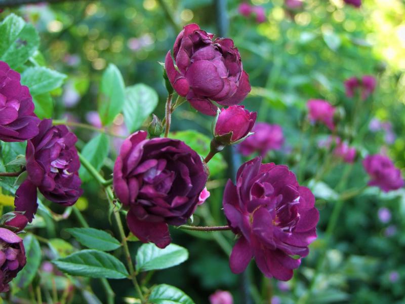 'Thor'Kletterrose,schwer zu fotografieren,weil das Licht auf diesen Samtblüten so sehr irisiert.