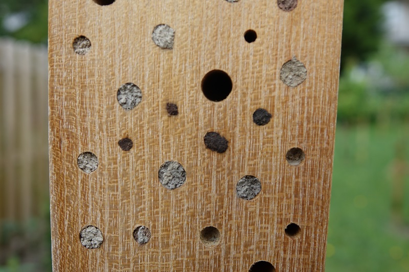 Die Nisthilfen haben wohl nicht so ganz gereicht - alle diesjährig zur Verfügung gestellten Holz- und MDF-Blöcke sind zugemauert. Manche der Löcher sind nicht ganz bis vorn genutzt worden.
