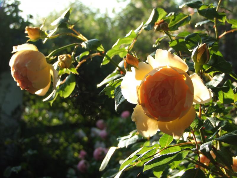 Die Rose hatte vor zwei Jahren, als sie von den sie bedrängenden Koniferen befreit wurde, noch zwei lebende Zweige. Und eigentlich hatten wir schon das Urteil gefällt. Aber im vergangenen Jahr kamen die ersten zaghaften Blüten und in diesem Jahr hat sie das alte Pavillongerüst erobert.