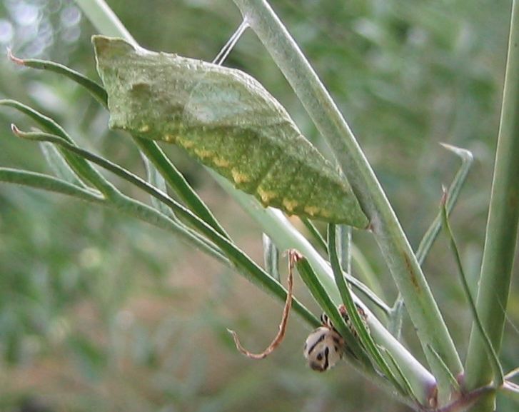 Hier ein neues Bild der Schwalbenschwanzpuppe.Unten hängt in der Pflanzengabelung wohl die Raupenhaut.