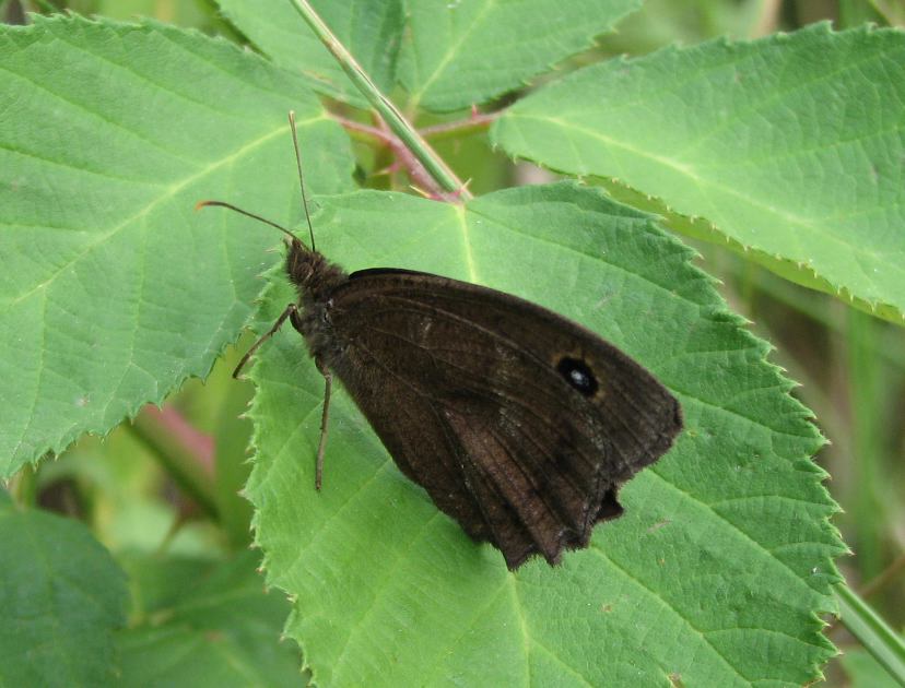 Blauäugiger Waldportier RL! Minois dryas SCOP.Flügelspannweite von 45-60 mm. Ihre Flügeloberseite ist dunkelbraun, leicht schwarzblau schimmernd, und weist je Vorderflügel zwei kleine, schwarze Augenflecken mit hellblauem Kern auf, von denen der äußere etwas kleiner als der innere ist. Beim Männchen sind diese Flecken deutlich kleiner, als beim Weibchen. Die Flügelunterseite ist dunkel graubraun gefärbt, hat einen gleich wie auf der Oberseite aussehenden Augenflecken je Vorderflügel und eine über Vorder- und Hinterflügel verlaufende, gerade noch zu erkennende blass graue Binde.Typisch ist sein hüpfender Flug.
