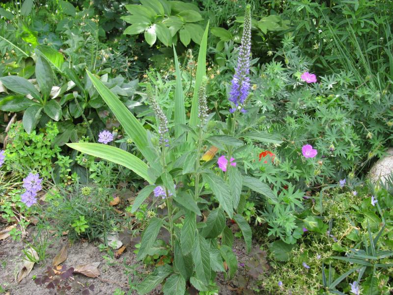 von Veronica longifolia scheint es verschiedene Ökotypen zu geben. Die im Hermannshof ausgelesene Sorte ist trockenresistenter und überhaupt vitaler als alles, was ich bisher an Veronica longifolia hatte. Eine besondere Eigenschaft ist ihre leichte Vermehrbarkeit durch Stecklinge. Ich hatte die 20 cm hohen Triebe einfach in den im April trockenen Boden gesteckt. Nicht gegossen, die Stängelchen sahen erbärmlich aus, neigten sich schlapp und lümmelten auf dem Boden. Dann richteten sie sich wieder auf und wuchsen weiter. Bevor der große Regen kam. Was sie jetzt machen kann ich nicht beurteilen, die Bepflanzung ist dicht.