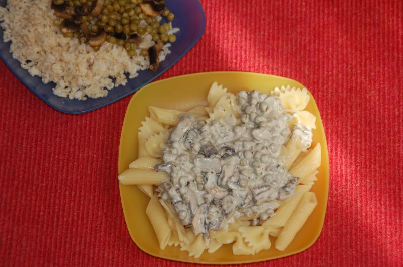 Essen 1: Nudeln mit Erbsensauce (Champignons, Erbsen, Creme fraiche, Frischkäse, Salz)