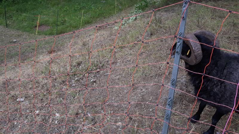 Der Tag verlief allerbestens. Zu viert geht ja alles leichter von der Hand. Ein Bock sorgte für Schrecksekunden, weil er wenige Minuten nach Strom aus zwecks Neuzäunung sich mal eben unterm Netz durchquetschte. Ein WGH im Flunderformat. Auch noch nicht erlebt. Da die anderen Böcke dankend auf diese Zirkusnummer verzichteten, blieb er grasend auf der anderen Seite stehen, so dass wir rasch die sogenannte Beule zäunen konnten, um die Truppe bei der Stange im frischen Grün zu halten und die alte Zäunung abbauen zu können. So ein Schlingel aber auch!