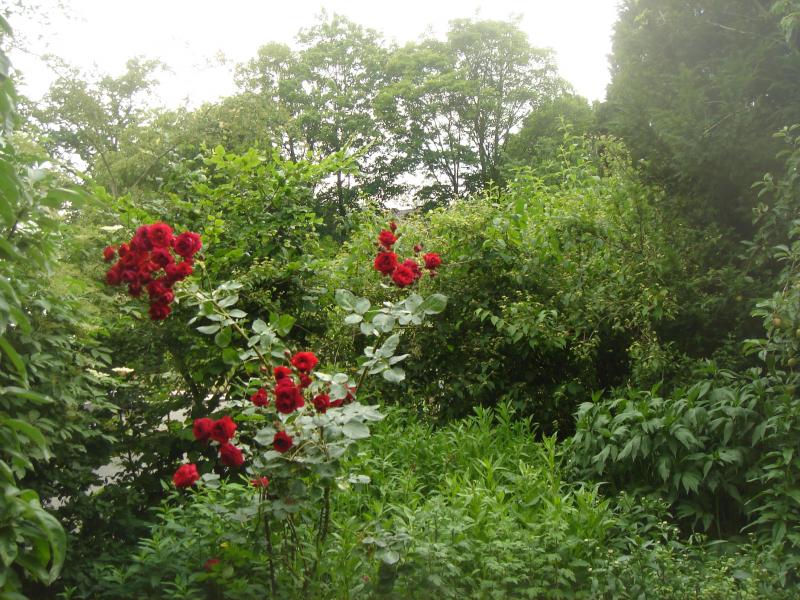 Auch im Vorgarten, andere Ecke : Strauchrose rot ( Sorte ?) erhebt sich aus grünen Staudenmeer.
