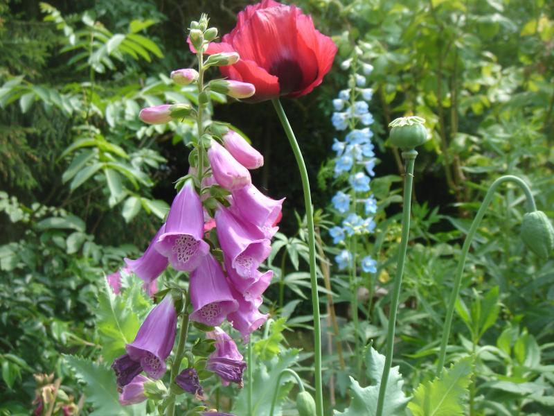 Fingerhüte gibt´s dieses Jahr leider nur wenige -- hier einer davon, mit Mohn und Delphinium im Hintergrund