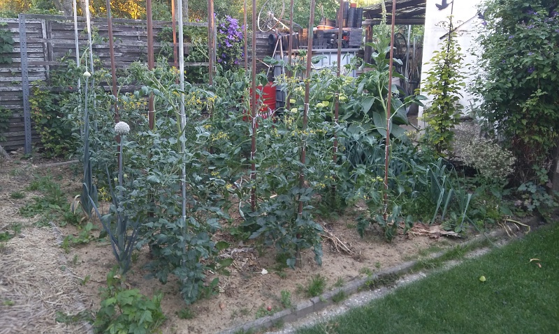 Hier ist Golfballgröße noch weit entfernt, aber es wird fleißig geblüht und neulich hab ich eine Hummel gesehen, die sehr fleißig war. Ein paar Früchte sind auch schon dran, jetzt müssen die Tomaten nur zweimal eine Woche Abwesenheit überleben, ich hoffe die Nachbarn erklären sich bereit zu gießen.