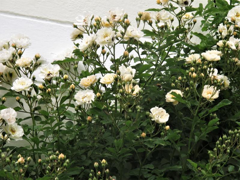 Der Goldfinch war schon im ersten Stock (Ostseite, Gemüsegarten), dann mußte ich ihn auf 1/2 m schneiden, worauf er erst recht loslegte. Letztes Jahr habe ich nur die Triebe gekürzt und geschaut, was passiert, und siehe da: