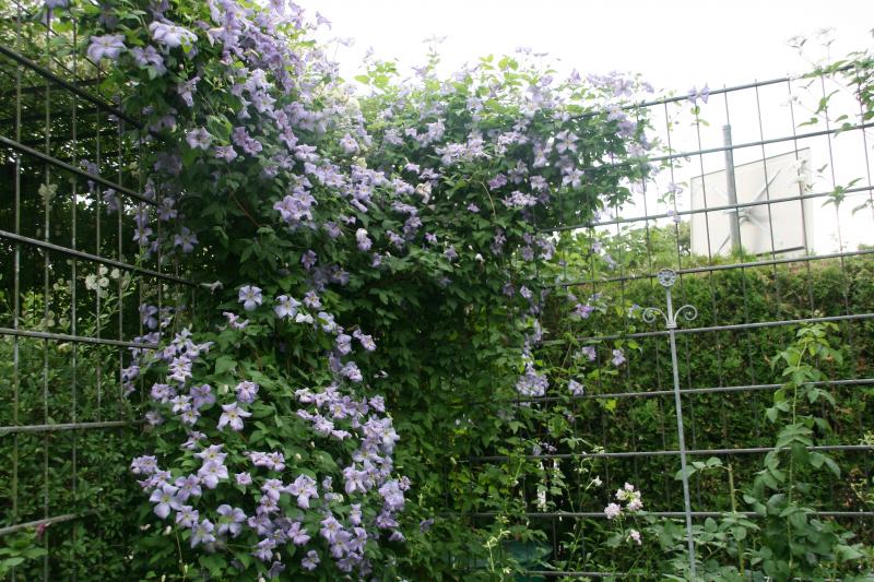 Die Cl.vit.botanische Art habe ich nie gepflanzt, sie war auf einmal da. Sie ist aus einem Rosenstock rausgewachsen. Habe jetzt ein Gestell hingestellt und leite sie immer dort hin. Sie ist mitten im Rosenstock, kann sie also nicht so einfach ausgraben, ohne die Rose zu zerstören. So lange es so geht mache ich das so.