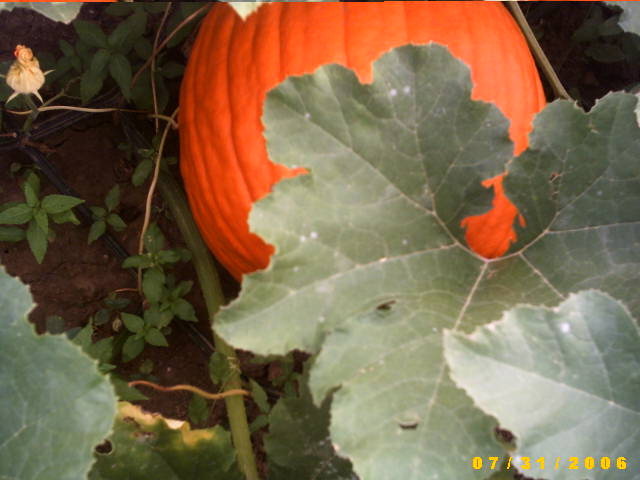 Ich habe meinen heute mal fotografiert, d.h. 2, die an derselben Pflanze wachsen. Einer ist noch grün, der andere inzwischen orange. Das müßten meine Halloweenkürbisse sein. Ist die Sorte "Baby Bear" nicht etwas flacher?Zuerst der grüne: