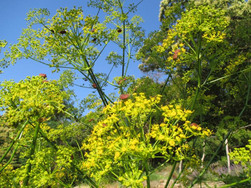 Opopanax chironium hat 7 Jahr gebraucht bis er das erste -mal einen Blütenstengel schob. Jetzt hat er 3, ist fast 2,50m hoch und bei Insekten sehr beliebt. Nach der Blüte zieht die Pflanze vollkommen ein.