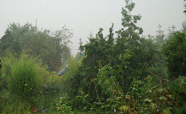 Nun siehts zwar noch finster aus - aber ich glaube, die Pflanzen können aufatmen, meine Regentonnen sind wieder voll ( das ging soooo schnell!!! ), Teiche voll, Tiere glücklich - alle glücklich