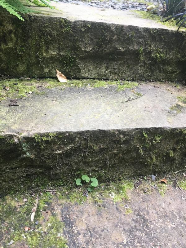 Der Star der Fugen ist hier diese Hosta, sie hebt allmählich die Platten hoch. Noch nie gab es zuvor einen Hosta-Spontansämling, zumal ich die Blüten nach dem Abblühen abschneide.