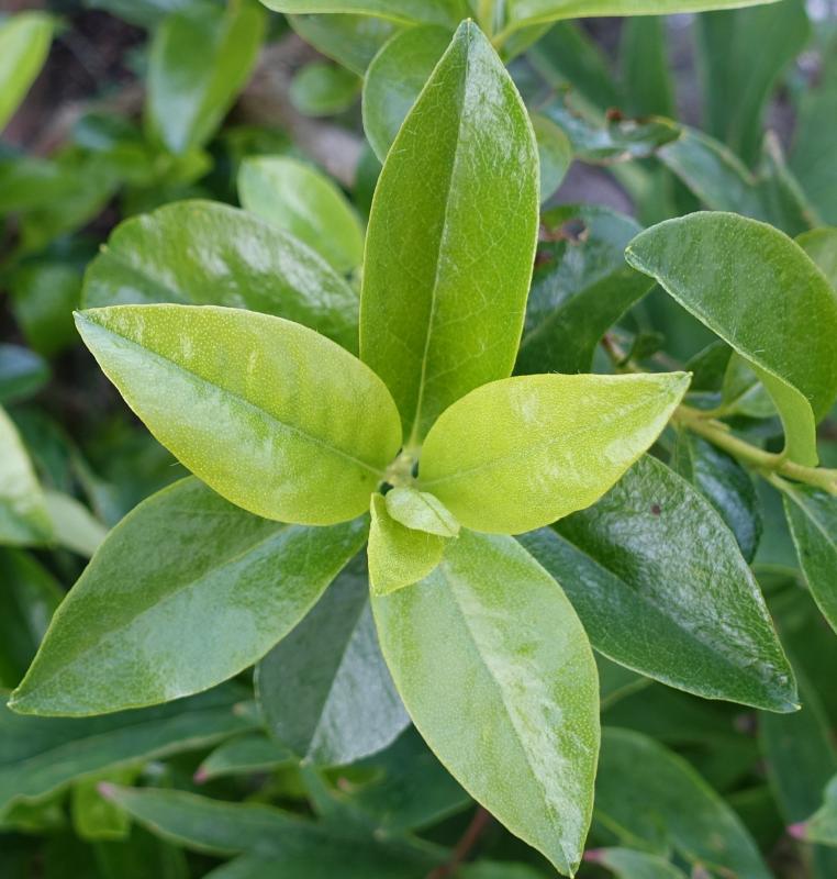 Nun sind die Blätter etwa 5cm lang, glänzend und spitz zulaufend.