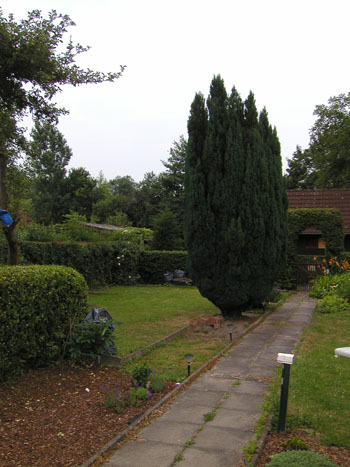 Das stimmt, Wacholder (muss schon alt sein) davon noch ein anderes Exemplar und 2 noch kleinere. Selbige möchte ich aber raushaben, da es für mich so einen Friedhofsflair hat. Der Baum bei der Bank wächst nur in die Höhe und zur Krone blickt man gar nicht auf. Dort würde ich lieber Sträucher (duftig) und Stauden setzen. Für die Bäume als Ersatz gern Zierkirsche oder Cornellkirsche (o.ä.). Die Plattenarbeitsflächenidee ist gut. Davon habe ich auch noch jede Menge rumfliegen. Vielleicht kann ich zwischen die Platten ja Teppichthymian setzen.Bild 5